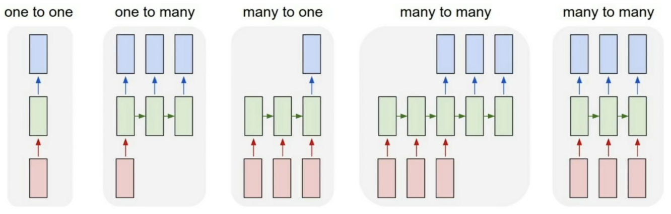 one-to-one은 하나의 인풋에 대해서 하나의 아웃풋이 나오는 모델이며 Vanilla Neural Networks라고 부릅니다. one-to-many는 하나의 인풋에 대해 여러개의 아웃풋이 나오는 모델로 보통 Image Captioning을 할 때 사용됩니다. 하나의 이미지에 대해서 여러개의 단어들을 뽑아내어 캡션을 달아줍니다. many-to-one은 여러개의 인풋에 대해 하나의 아웃풋만 나옵니다. 이는 보통 감정구별할 때 많이 쓰입니다. 대표적인 예시로 영화를 본 후기를 보고 긍정적인지 부정적인지 알려주는 것입니다. 그 다음은 many-to-many입니다. 여러개의 인풋이 들어가 여러개의 아웃풋이 들어가는데 이는 2가지로 나뉩니다. 인풋이 들어갔을 때 바로 아웃풋이 나오는지에 대한 유무로 나뉘게 됩니다. 바로 나오지 않는다면 기계번역할 때, 바로 나온다면 비디오에서 프레임 단위로 classification할 때를 대표적인 예시로 들 수 있습니다.