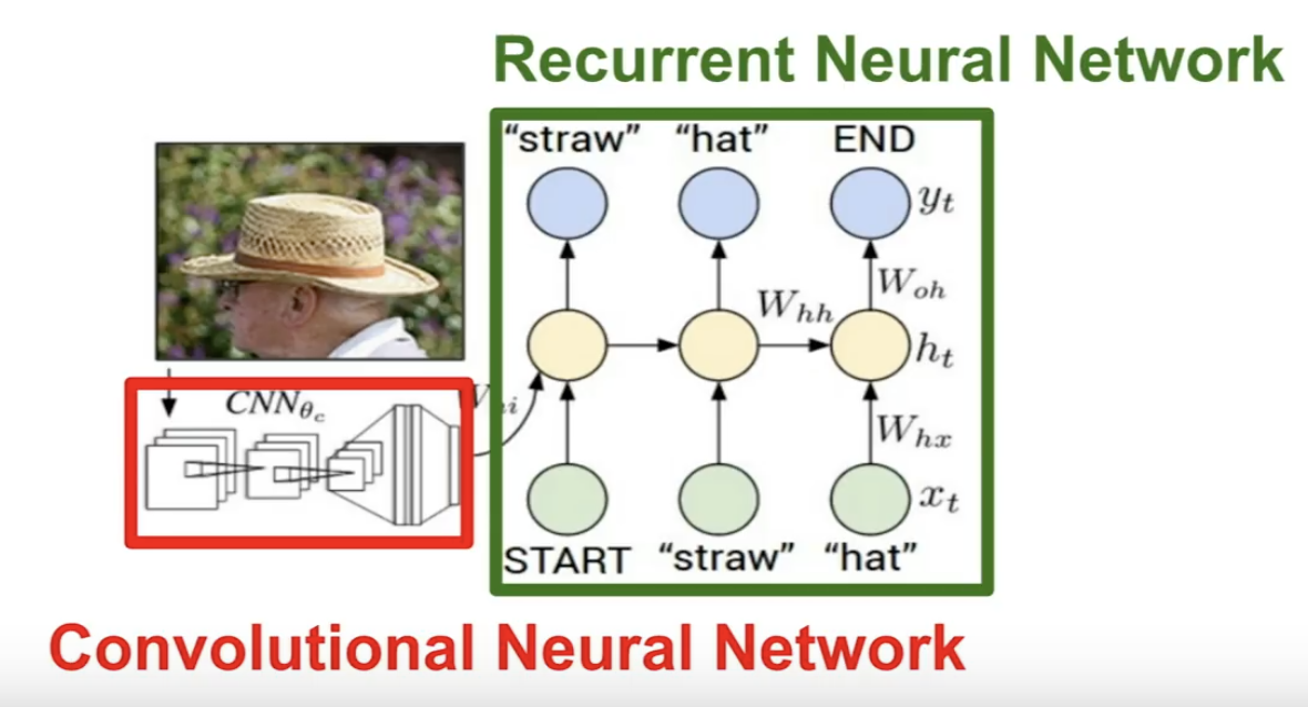Image Captioning 같은 경우에 다음과 같은 Neural Network로 이루어져 있습니다. CNN이 끝나고 그 결과가 RNN의 첫번째 state로 들어가게 되는것입니다. 만약 RNN을 학습하다가 데이터셋에 있는 문장이 끝나게 되면 토큰을 사용해 종료됨을 알려줍니다. 이렇게 학습을 하면 실제로 테스트할 때도 문장을 만들다가 끝이 나면 토큰을 반환해주어 끝을 알려줍니다.