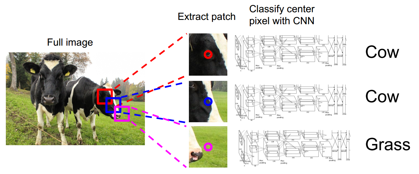 앞에 semantic segmantatino에서처럼, 가장 단순하게 생각할 수 있는 방법은 window를 이동시키며 일일히 classification CNN에 넣어주는 것입니다. 그런데 이번에는 물체의 크기도 정해져 있지 않기 때문에 가능한 모든 크기의 window를 slide 해주어야 합니다. 딱 봐도 어마어마한 양의 계산이 필요하겠죠? 모든 크기의 window를 slide해야하는건 train할때뿐만 아니라 실제로 사용할때도 필요하기 때문에 train도, 실제 사용도 감당할 만한 계산량이 아닙니다.