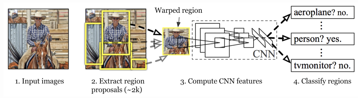 앞의 계산량 문제를 어느정도 해결한 것이 R-CNN입니다. R-CNN 우선 selective search 를 사용하여 computation 할만한 정도의 개수의 bounding box region을 잡아줍니다. selective search는 전혀 딥러닝적이지 않은, 전통적인 알고리즘적 방법입니다. 이 bounding reigion을 이제 같은 CNN으로 처리해줘야 하니까 모두 같은 크기로 warp 해주고, 그 후에는 앞에서 본 classification + localization 을 위한 CNN처럼 해주면 됩니다. 이제는 계산량이 감당 불가능할 정도는 아니지만, 이래도 여전히 꽤 느리다고 합니다.
