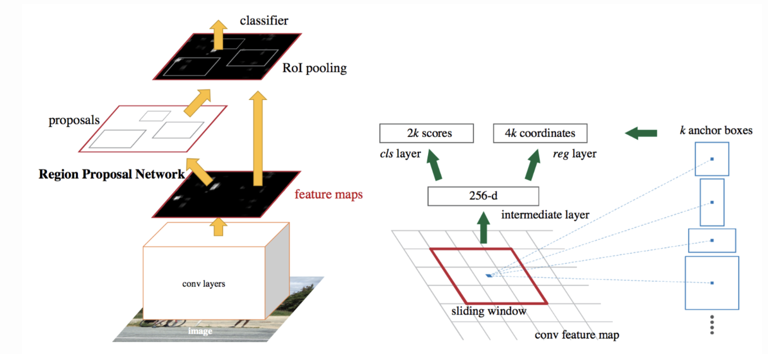 하지만 이제 CNN 단계가 엄청나게 빨라져서 앞에서 얼마 안걸리는것 같았던 전통적인 알고리즘적 selective search가 bottleneck이 되어버렸습니다. 그래서 이제는 이것도 네트워크가 학습하도록 했습니다. 이미지 전체를 어느정도 Convolution 을 시키고, 여기에서 나온 feature map을 region 을 예측하기 위한 network 에 넣어주고, 이 결과를 가지고 나머지는 Fast-R-CNN 처럼 해주면 됩니다. 이제는 네트워크 두개에 대해서 classification 과 regression을 해야 하기 때문에 이 loss들에 대한 weight 설정이 아주 중요하고 어렵습니다.