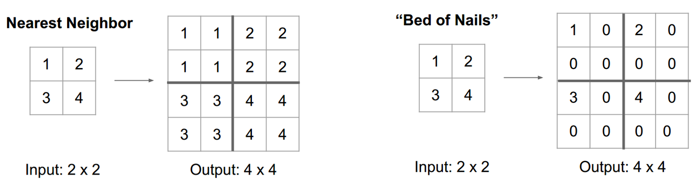 우선 pooling 을 반대로 해주는것을 unpooling이라고 합니다. 그림에서 보듯이 nearest neighbor 방법은 같은 값으로 unpooling한 만큼 다 채워주는 것이고, bed of nails 는 값을 무조건 좌측 상단 끝에 놓고 나머지를 모두 0으로 채워주는 방법입니다.