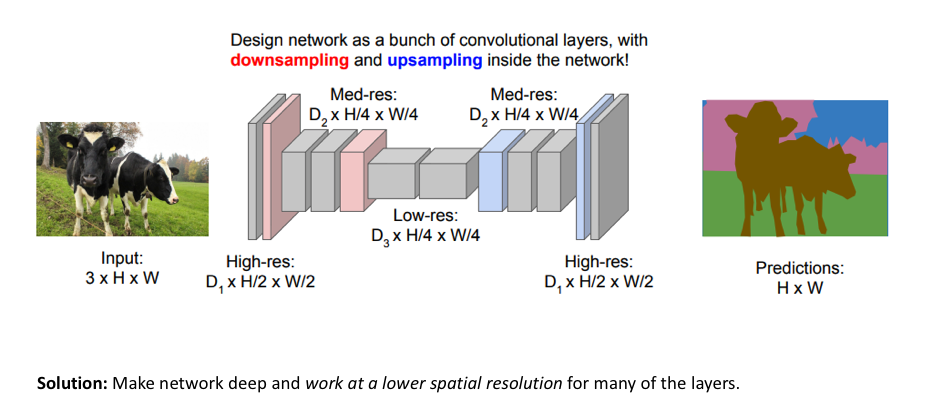 앞의 두 방법이 너무 많은 계산량을 요구했기 때문에 생각한 방법이 downsmapling 과 upsampling을 이용하는 것입니다. Downsampling을 통해서 데이터 크기를 줄인뒤에 computational 한 이점을 가진 상태로 여러 단계를 거쳐 계산해 주고, 나중에 다시 upsampling을 통해 필요한 원래 크기의 output을 얻겠다는 것입니다. Classification에서 했던 downsampling을 그대로 하고, 그대신 원래 downsampling 의 효과가 있는 pooling과 stride 가 1보다 큰 convolution 을 역으로 하는 것입니다.