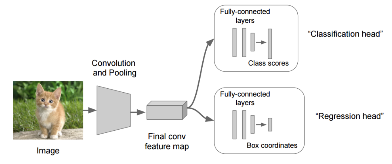 Classifciation + Localiazation 은 말 그대로 위의 그림처럼 어떤 이미지에 대해서 어떤 물체인지 Classification을 하고, 그 물체의 Bounding Box를 찾아주는 것입니다. Bounding Box는 일단은 회전 없는 예쁜 직사각형이라고 생각합시다.