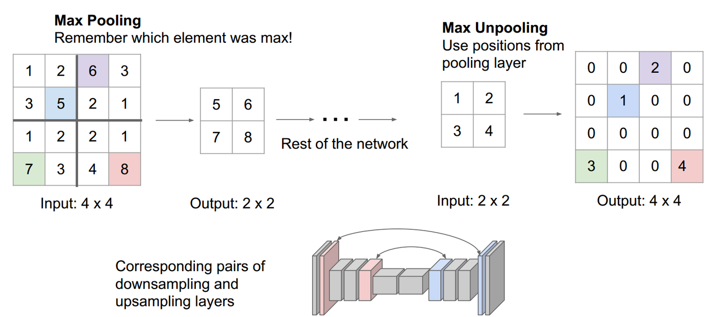 Max Unpooling이란 앞에서 Max pooling을 하면서 사용되었던 max값의 위치를 기억해 놓았다가 뒤에서 unpooling을 할때 그 위치를 기억해서 그자리만 값을 유지해 주고 나머지는 0으로 채워주는 것을 말합니다. bed of nails보다 좀더 당위성 있어 보이는 방법입니다. 물론 이 방법은 각 unpooling 이 앞에 pooling layer에 대응되는, 대칭적인 구조의 네트워크에서만 사용될 수 있습니다.