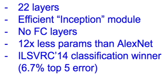 GoogLeNet의 정보는 위와 같습니다. 총 22개의 층이 있고 효율적인 Inception Module을 사용했으며 Fully Connected Layer를 사용하지 않았습니다.