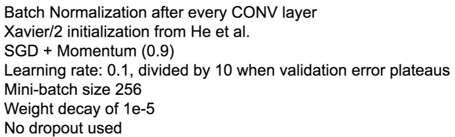 그렇게 생성된 ResNet의 구조는 위와 같습니다. 반복적으로 Convolution Layer의 필터 개수를 2배로 증가시키고 stride 2로 downsampling을 합니다. 그리고 Classification을 위한 1000 Fully Connected Layer만 사용합니다. 또한 네트워크가 깊어짐에 따라서 GoogLeNet에서 사용했던 Bottleneck을 적용해 효율성을 증가시켰습니다.