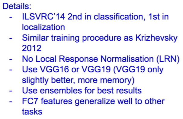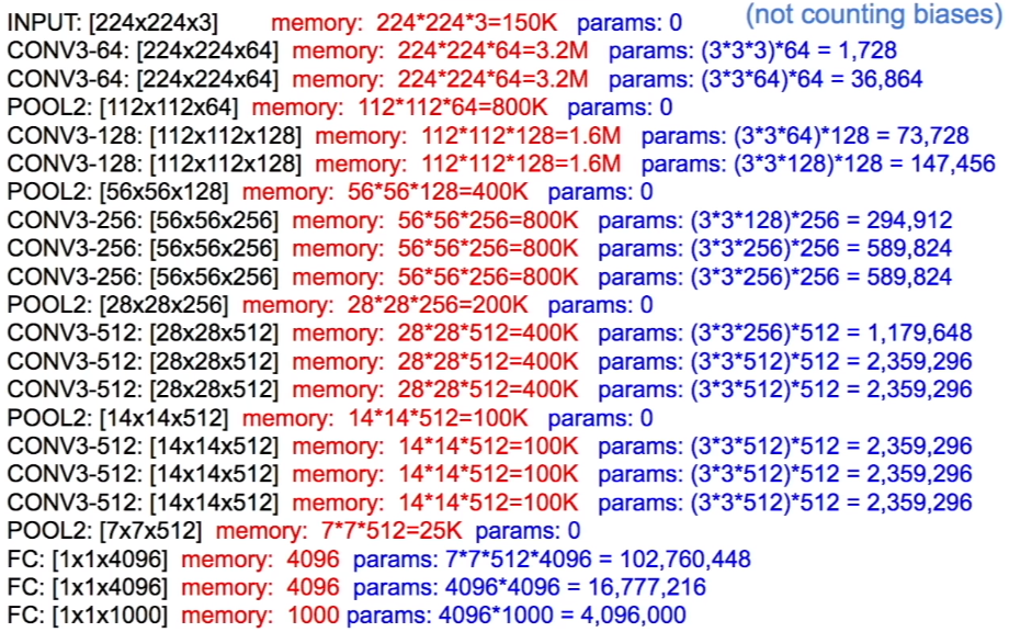 VGG Net의 각 층에 대한 filter size와 parameter수, memory 용량은 위와 같습니다. 이미지당 96MB의 메모리와 138M개의 파라미터를 가지고 있습니다. 이는 순전파 때의 경우만 말한 것이고 역전파를 할 때에는 더 큰 메모리가 필요합니다. 따라서 굉장히 큰 메모리를 필요로 한다고 할 수 있습니다. 한가지 알아둘 점은 초기의 Convolution Layer가 많은 메모리를 차지하고 마지막 부분의 Fully Connected Layer가 많은 Parameter를 차지한다는 점입니다. 나중에 나올 모델들은 Fully Connected Layer의 parameter를 줄이기 위해 노력합니다.