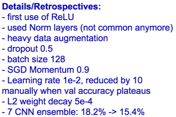CNN(Convolution Neural Network)은 근래에 시각 인식 인공지능에 자주 사용되는 네트워크 구조입니다. CNN이 자주 사용되는 이유는 무엇보다도 다른 것들보다 좋은 성능을 보이기 때문입니다. 이 글은 CS231n 유튜브 강의 9강에서 다룬 Imagenet classification 대회에서 좋은 성적을 거둔 CNN Architecture에 대해 소개할 것입니다.