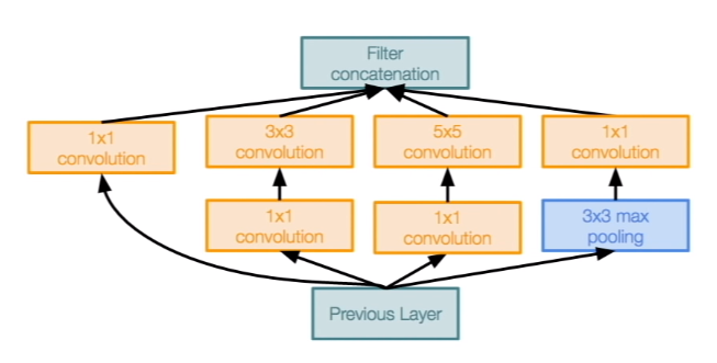 또한 GoogLeNet은 Inception Module이란 것을 사용했습니다. 위의 사진에서 각 층에서 여러개의 화살표로 뻗어나가서 하나로 합쳐지는 모양을 확인하실 수 있는데 이것이 Inception Module입니다. Inception Module이란 input으로 들어온 데이터를 하나의 층에서 여러 필터 사이즈로 Convolution을 병렬적으로 행합니다. 이렇게 해서 나온 output들을 모두 엮어서 다음 층으로 전달합니다.