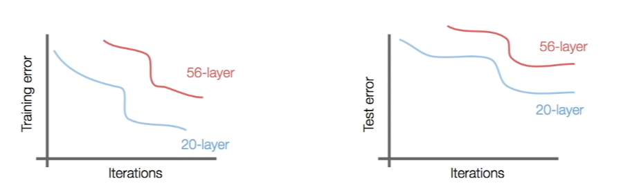 하지만 이렇게 층을 깊게 쌓기만 하는 것은 좋지 못했습니다. 위의 그래프에서 56개의 층을 쌓아 올린 모델이 20개의 층을 가진 모델보다 안 좋은 성적을 보이는 것을 확인 할수 있습니다. 56-layer를 가진 모델이 training에서도 좋지 않은 성적을 보입니다. 여기서 알 수 있는 사실은 더 깊은 모델이 overfitting 되지 않는 다는 점이었습니다. 그래서 이제 사람들은 깊은 네트워크의 성적이 좋지 않은 것이 최적화가 되지 않았기 때문이라 생각하고 이것을 어떻게 최적화시킬 것인지 고민하게 됩니다.