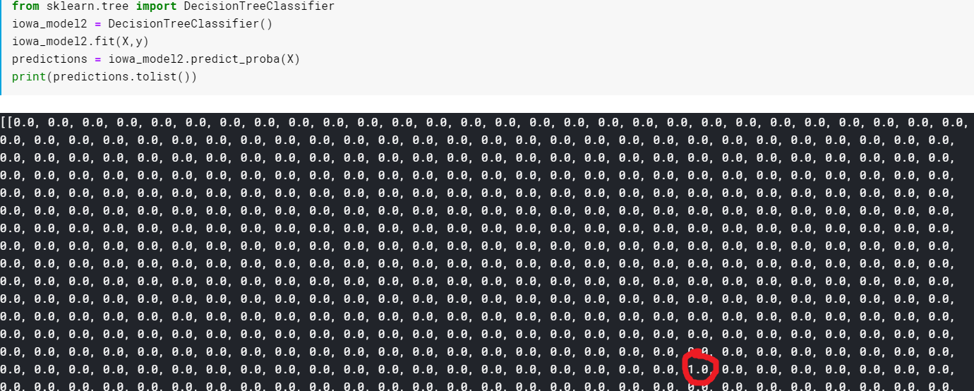 그런데 이를 조사하며 몰랐던 것을 하나 알게되었는데, scikit learn의 DecisionTreeClassifier는 max_depth를 임의로 정해주지 않으면 자동으로 모든 leaf가 pure해질때까지 나눕니다. 그말인 즉슨, 모든 leaf가 확실한 leaf이고, 확률은 모두 해당 클래스에 대해서만 1이라는 것이죠.