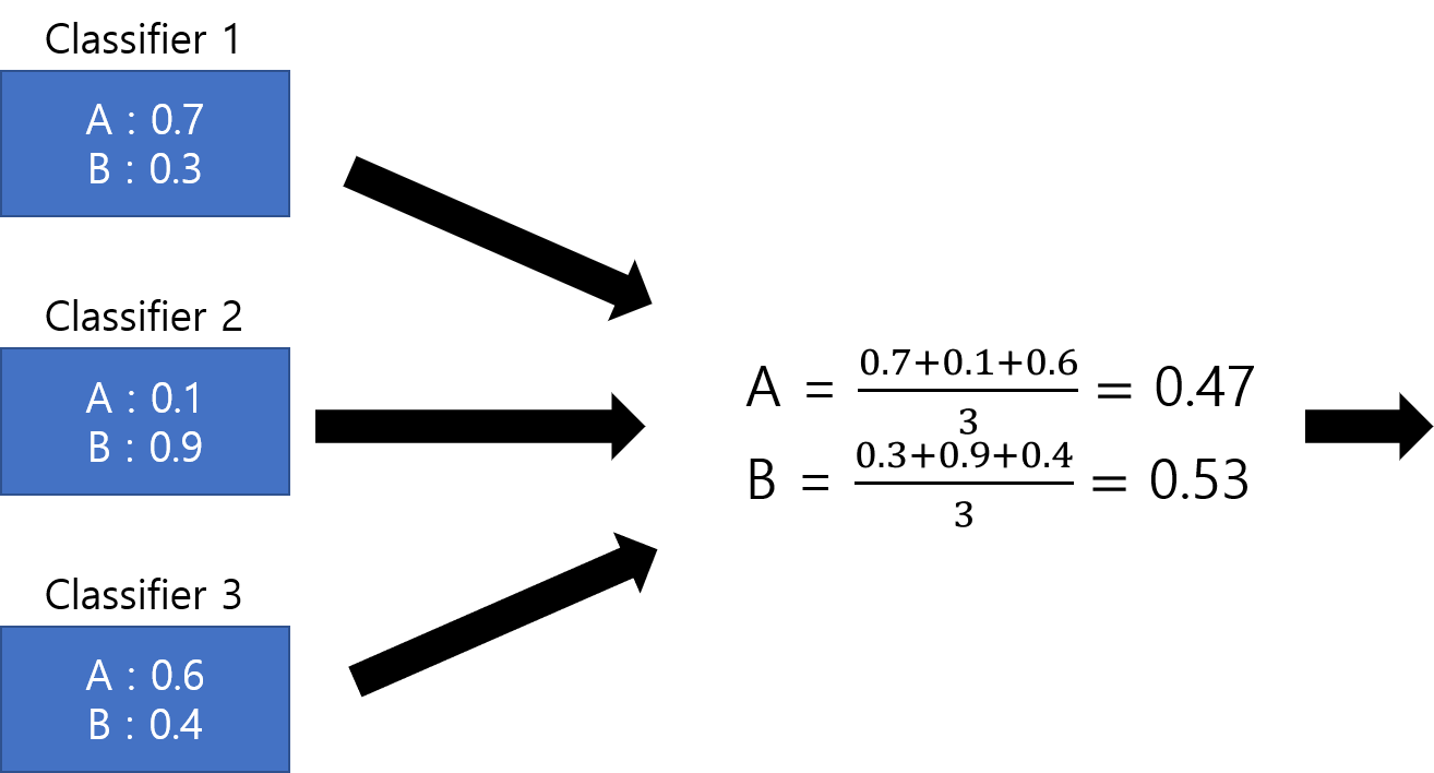 Soft Voting, 다른말로 Probability Voting도 매우 간단합니다. 각 class별로 모델들이 예측한 probability를 합산해서 가장 높은 class를 선택하면 됩니다.