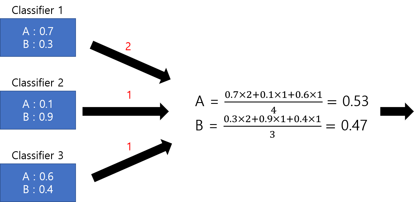이렇게 보면 정말 쉽고 확실하지만, Soft Voting과 Weighted Voting을 헷갈리는 이유는 말로 풀어 썼을 때 굉장히 비슷하기 때문입니다. 두 방법 모두 더 ‘확실한’ 모델에 대해서 더 큰 가중치를 주는 것이기 때문이죠. Soft Voting도 probability 계산을 못하는 관점에서 생각해보면 A가 0.9라고 한 모델이 A가 0.6이라고 한 모델보다 ‘확실’하기 때문입니다. 하지만 Soft Voting은 각 모델이 자기가 얼마나 확실한지를 반영하는 것이고, Weighted Voting은 전체 모델들 중에 얼마나 확실한지를... 말로 설명하려니 어렵네요. 이 포스트를 읽으셨고 확실히 구분이 된다면 이 문단은 무시하셔도 됩니다.