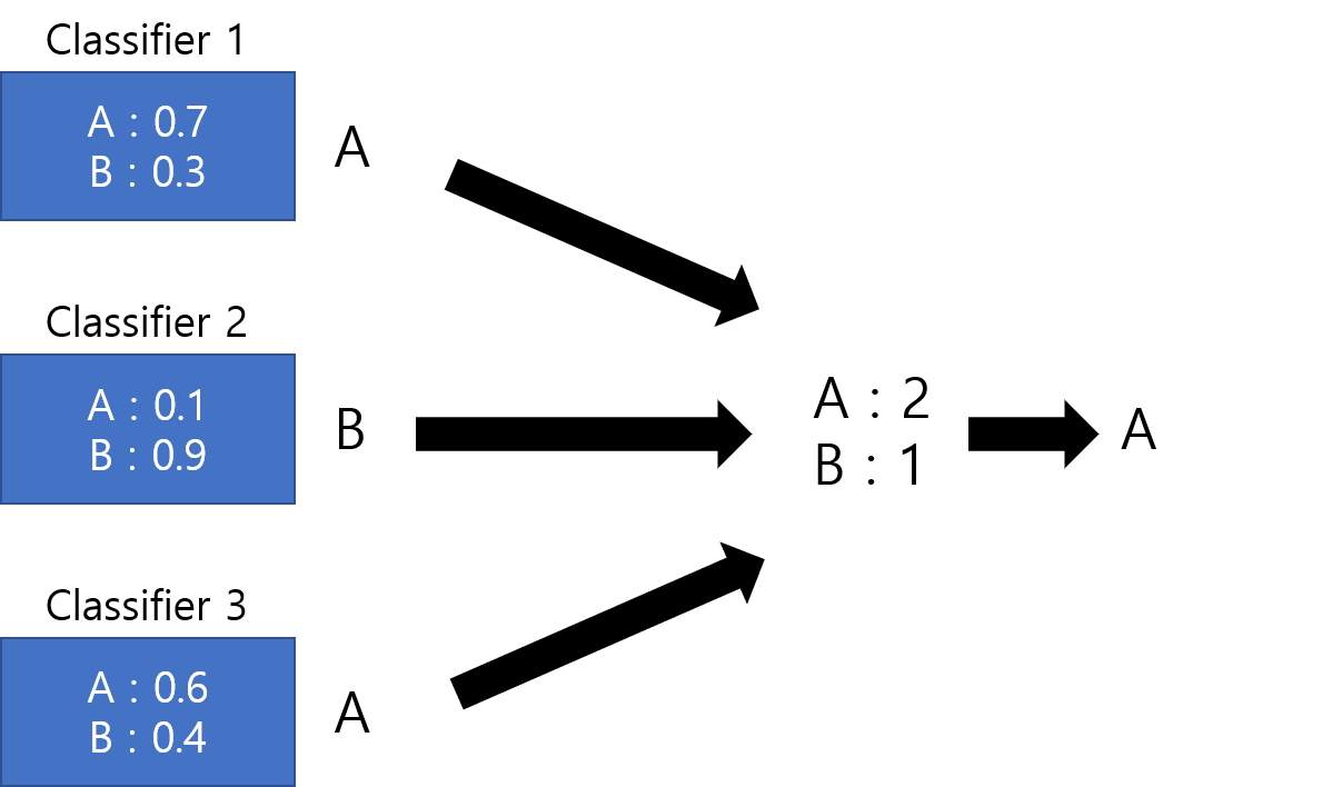 Hard Voting은 Majority Voting이라고도 하며, 각각의 모델들이 은 각각의 모델들이 결과를 예측하면 단순하게 가장 많은 표를 얻은 결과를 선택하는 것입니다. 정말 easy 하죠? Soft Voting과의 차이를 확실하게 하기 위해 각 모델이 class별 probability도 예측할 수 있는 예시를 보겠습니다.