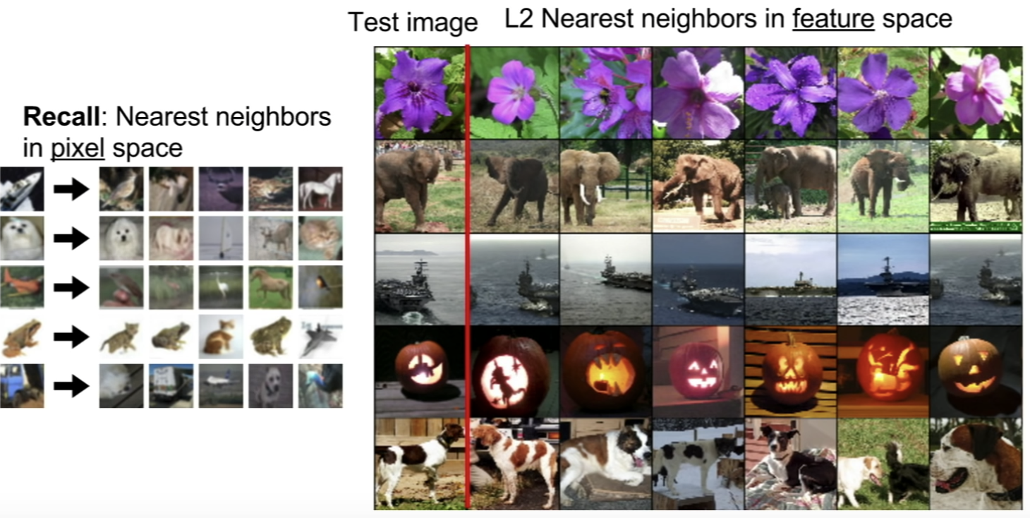 마지막 FC 층은 이미지의 전반적인 알짜 특성을 담고 있을 것으로 기대되는 층이다. 이전 강의에서 CIFAR-10 데이터셋을 사용하여 단순 픽셀값을 이용한 Nearest Neighbor 전략으로 비슷한 이미지를 추출하는 것과 AlexNet의 마지막 4096 차원의 FC 벡터값을 이용한 NN 전략을 비교해보면 어떤 통찰을 얻을 수 있다.