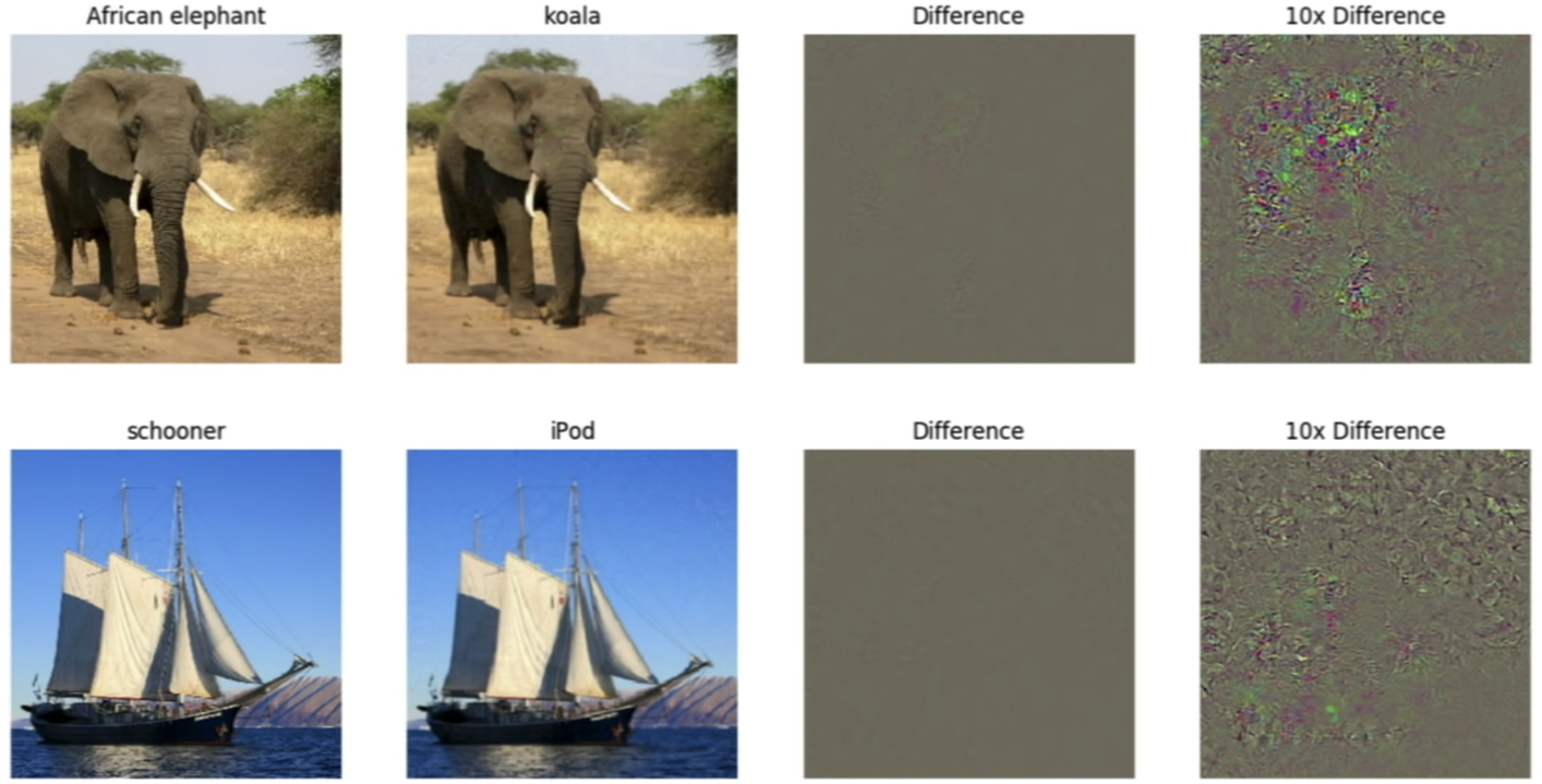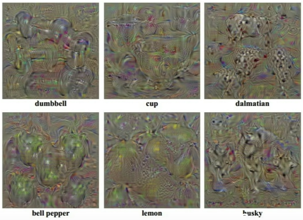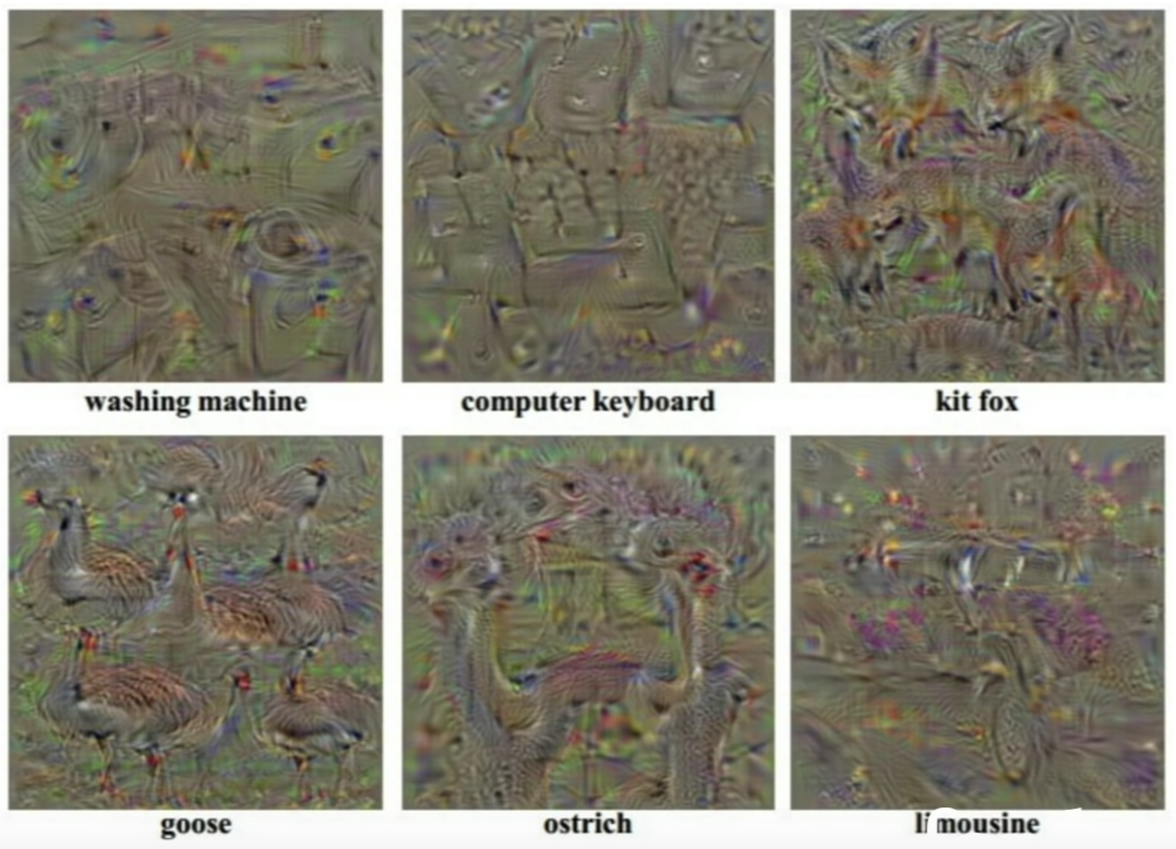 위와 같은 특성을 잘 생각해보면 특정 이미지로부터 시작해 완전 다른 라벨에 대한 활성값을 최대화하고자 하는 노력을 반복하면 이미지에 사람이 해석하기는 어려운 노이즈가 추가되어 훈련된 이미지넷으로서는 완전히 다른 이미지로 인식하게끔 만들수가 있다. 아래는 실제로 특정 이미지로부터 시작해 다른 Class Label의 활성도를 향상시키도록 재훈련을 시켰을 때 네트워크가 다른 사물로 인식하는 모습을 보여준다.