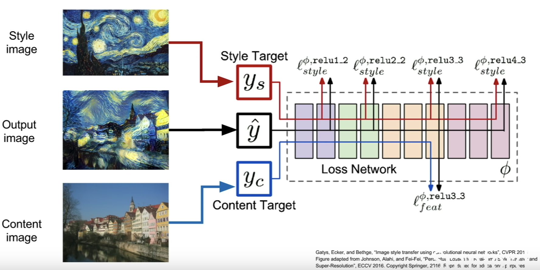 완전 새로운 이미지로부터 질감을 생성하기 보다 두 개의 이미지에 대한 질감 차이를 최소화 하는 방법을 사용함으로써 특정 이미지의 분위기를 합성하는 것도 가능하다. 이는 Style Transfer(스타일 변환)이라고도 잘 알려져있는 기법이며 두 이미지에서 각각 생성되는 Gram Matrix의 값을 최소화함으로써 이미지를 생성하는 기법이다. 유명한 화가의 그림과 일반적인 사진을 합성하면 다음과 같이 반 고흐의 화풍으로 사진을 재해석한 이미지를 얻을 수 있다.