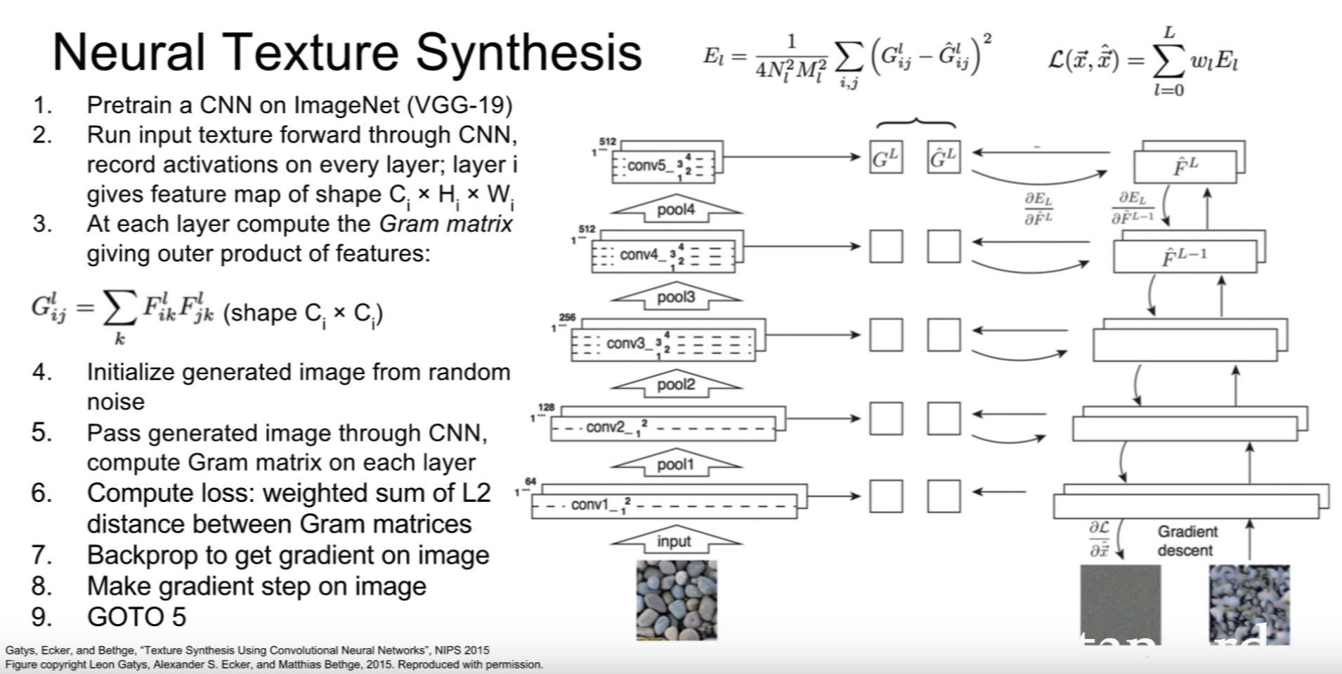 하지만 인공신경망 구조를 통해 Texture Synthesis의 성능을 조금 더 향상시킬 수 있다는 연구가 발표되었다. 해당 연구는 질감에 대한 정보를 ConvNet의 입력으로 제공한 뒤 질감을 설명하기 위한 추상적인 구조인 Gram-Matrix를 생성함으로써 목표를 달성할 수 있다고 주장한다. ConvNet의 특청 층으로부터 계산한 Gram Matrix의 차이를 이용해 Loss Function을 제작한 뒤 손실을 최소화 하기 위해 생성하고자 하는 입력 이미지 층으로 미분값을 역전파 했을 때 어느정도 주어진 질감에 해당하는 이미지를 생성할 수 있음을 보여준다.