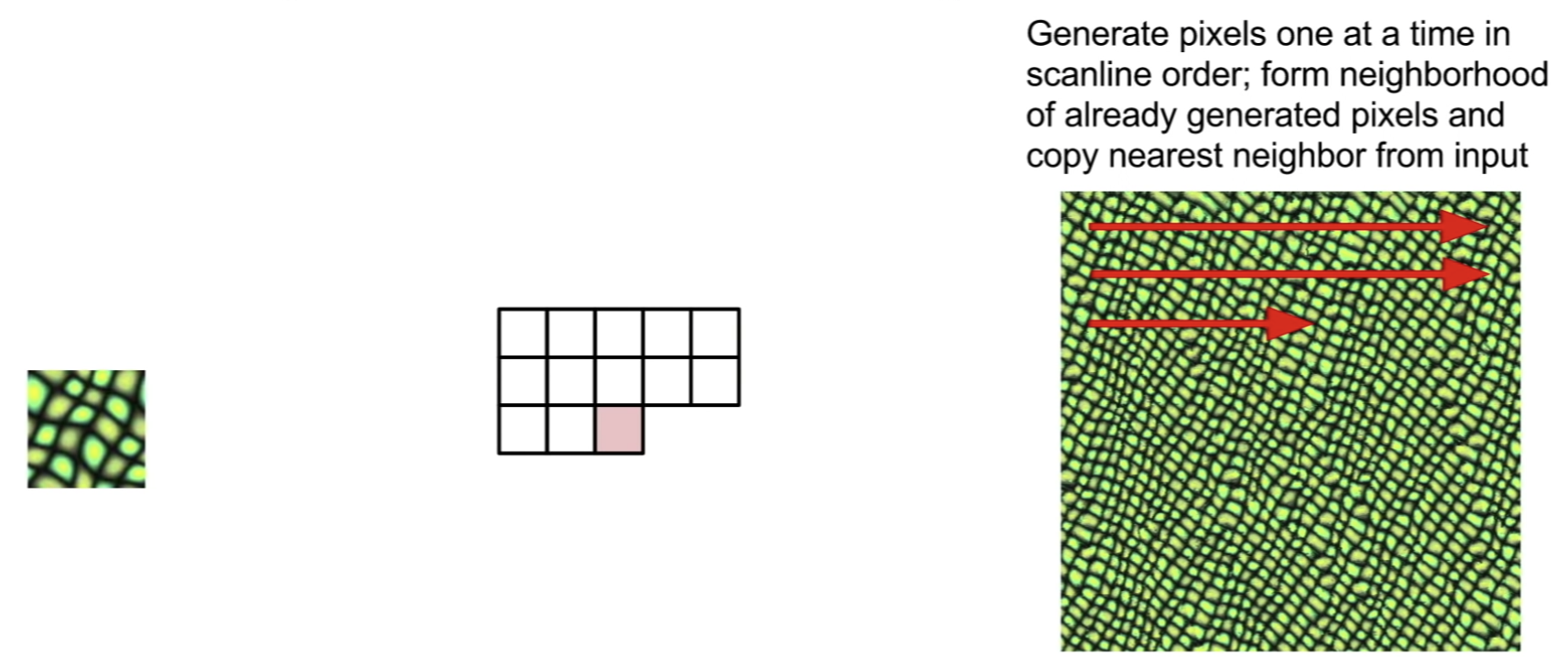 컴퓨터 그래픽을 많이 다루는 분야에서는 특정 질감을 생성하기 위해 사용하는 알고리즘이 있다. 대표적으로는 Nearest Neighbor 전략이 있으며 기존에 주어진 작은 질감 이미지로부터 가장 가까운 픽셀 값을 시시각각 찾아 채우고자 하는 필드를 채우는 것이다. 이는 나름 잘 동작하지만 특정 질감에 대해서는 어느정도 깨지는 현상이 나타난다.