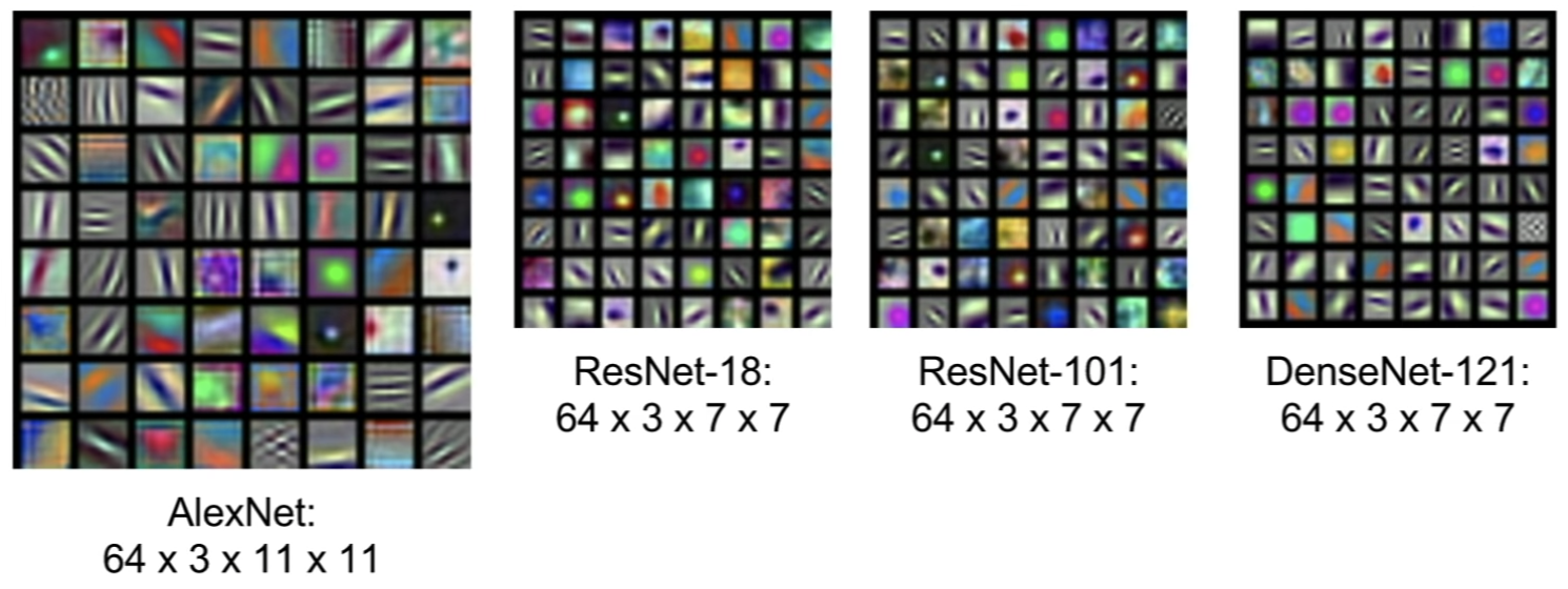 각 Feature Map에서 필터가 찾고자 하는 정보는 어떤것인지에 대한 정보를 얻기 위해서 수많은 이미지를 이용해 훈련이 완료된 네트워크에서 weight 값을 시각화하는 방법을 채택할 수 있다. 일반적으로 이미지를 분류하는 경우 입력 값으로 3xHxW 형태의 Tensor가 들어오게 되고 이에 따라 Convolutional Filter(이하 필터) 또한 RGB 세개의 채널을 가지게 되므로 각 필터의 형상(?)을 시각화하는 것이 가능하다. 다음은 ImageNet 챌린지에서 사용된 몇개의 네트워크의 첫번째 층에서 특징을 추출하는 필터를 시각화한 모습이다.