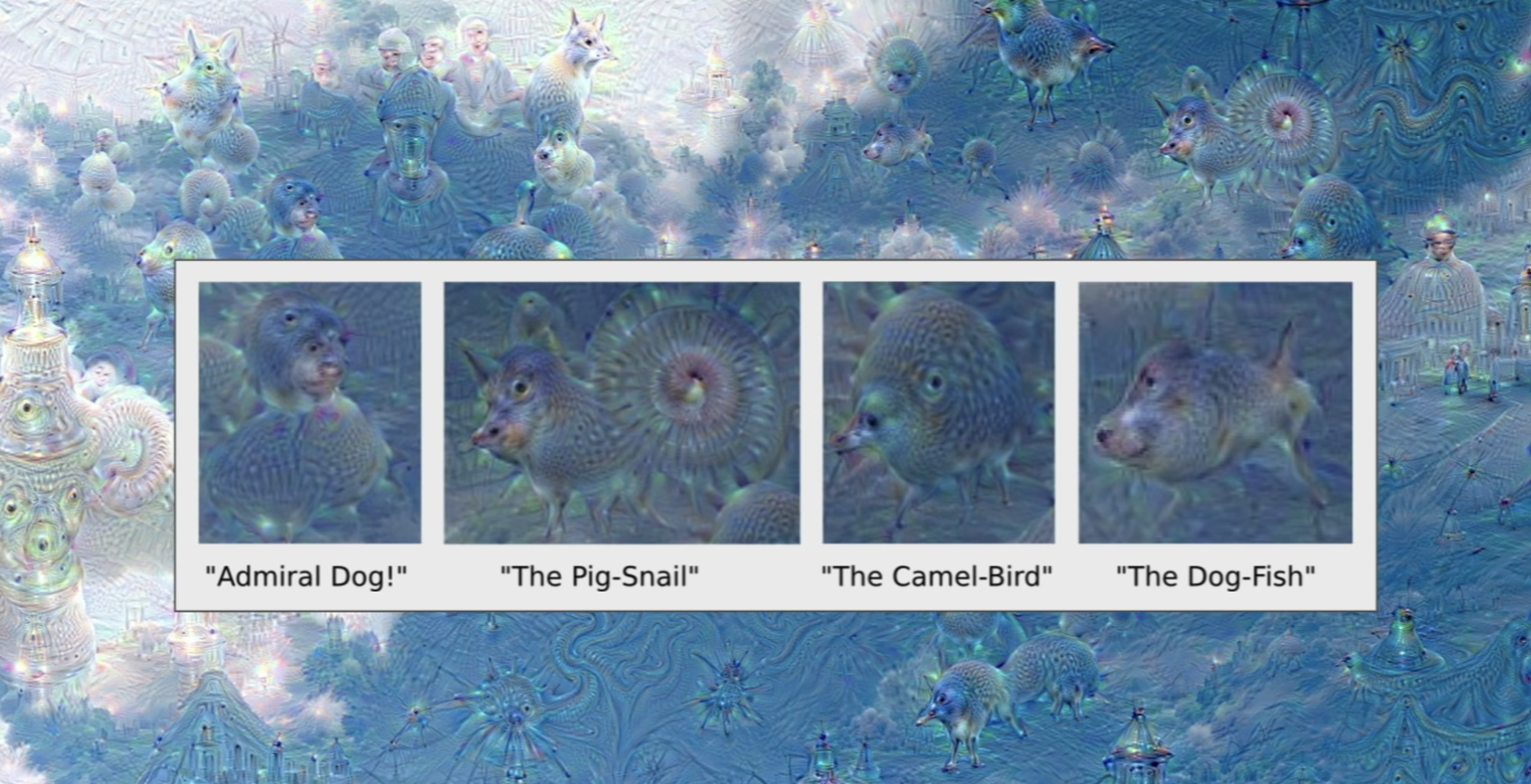 참고로 완전 새로이 초기화된 이미지가 아닌 이미 존재하는 이미지를 비슷한 방법을 이용해 Amplify 시켜 새로운 이미지를 생성하고자 하는 Deep Dream과 같은 시도가 있었으며 다음과 같은 이미지를 생성해내는 것을 확인할 수 있다. 이미지넷의 경우 개와 관련된 Label이 많았기 때문에 유난히 특이한 모습의 개들이 나타나는 것을 확인할 수 있다.